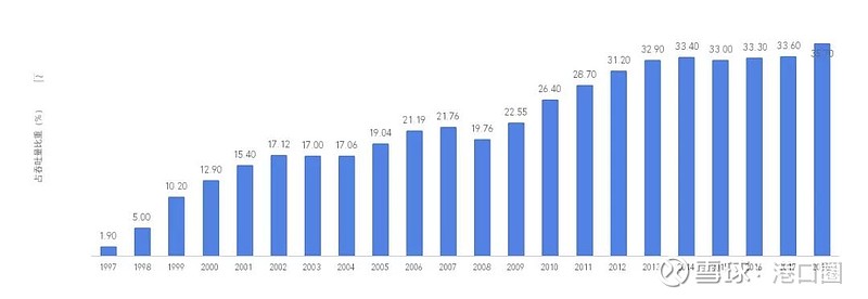 图3:1997-2018年中国港口内贸集装箱占吞吐量比重