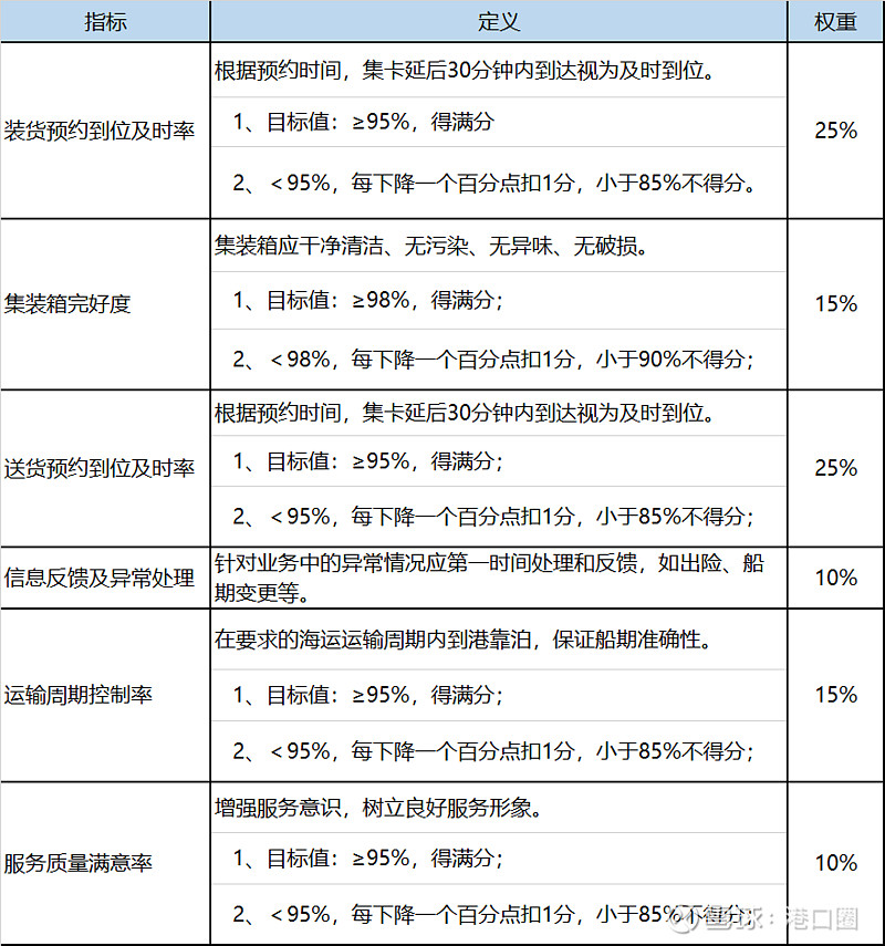 在前20年内贸航运发展过程中,很明显是以粗放型发展为主,客户的需求更多的集中在价格。但随着竞争的多元化,市场价格越来越透明,通过单纯的价格因素已很难维护或增加市场份额(价格在获取客户的权重是在下降的)。近期,国内某大型纸业龙头企业进行国内物流招投标,在招标文件中附带了物流承运商绩效考核表,对六项服务指标进行定义和权重的设定,摘要如表2。