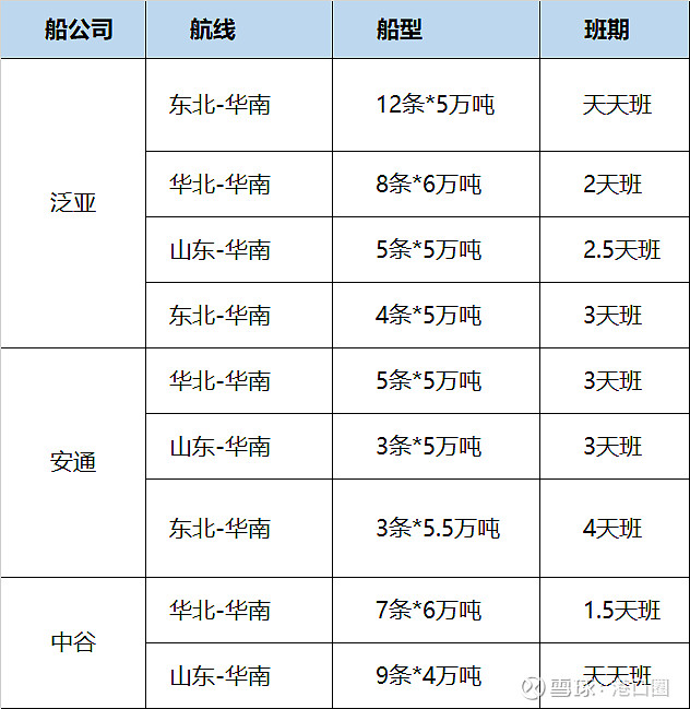 随着船舶大型化所带来的规模经济效应,目前内贸箱南北航线的主力船型基本都是5万吨以上。但船舶大型化以后,南下航线每条船的舱位利用率要达到90%以上才能实现规模效益。为满足客户需求,提升竞争力,目前新泛亚、安通和中谷在南北线的班期不断在加密,目前大多维持在2-3天一班(如表1)。
