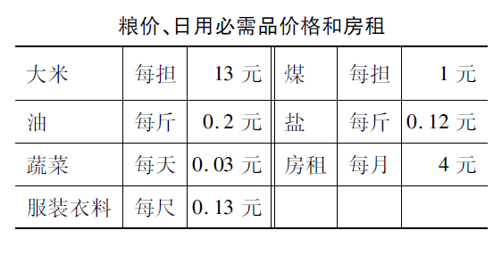房租价格:上海的石库门一层楼,有电灯、自来水,月租10块钱;住客栈,每一铺位3角5至6角;纱厂宿舍,月租2到5元不等,两层楼可住10 人,自来水由厂方提供,有的还供电,带家眷者,两家分租一层,费用不过1元多;最好的宿舍,为砖瓦结构,铺地板,长宽500立方尺,容积5000立方尺,有厨房、路灯和下水道,月租6至9元;此外,工人也可租地,结庐而住,半亩地年租金200元,21户人家分摊,平均下来每户每月8毛钱,当然,环境极差。