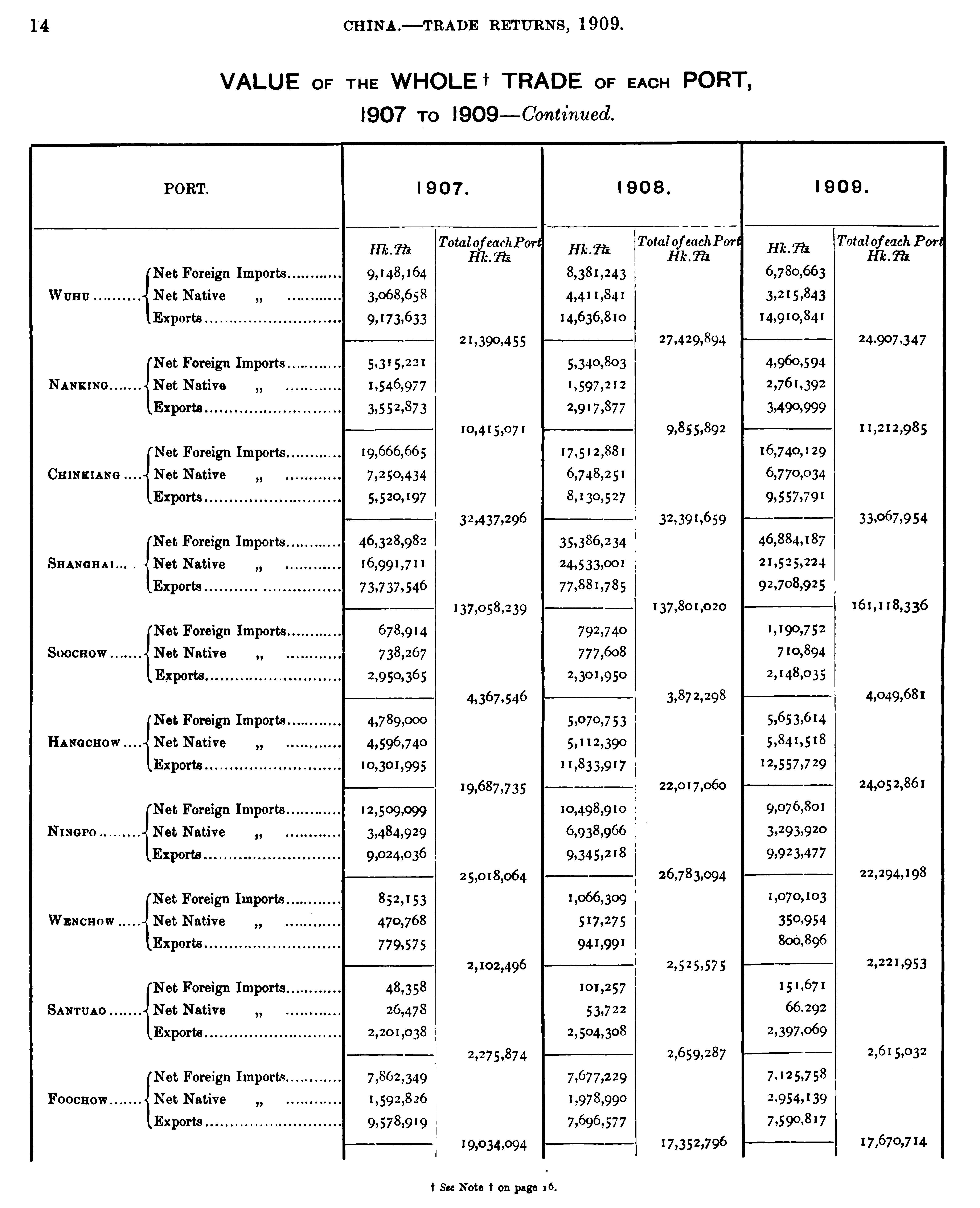 1907-1909年中国港口进出口总额排名(单位:百万香港海关两):