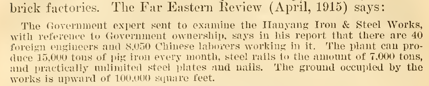 Hanyang Iron Works was the largest steel factory in China at the time. Ref: Industry_Week_1923 Page 227.